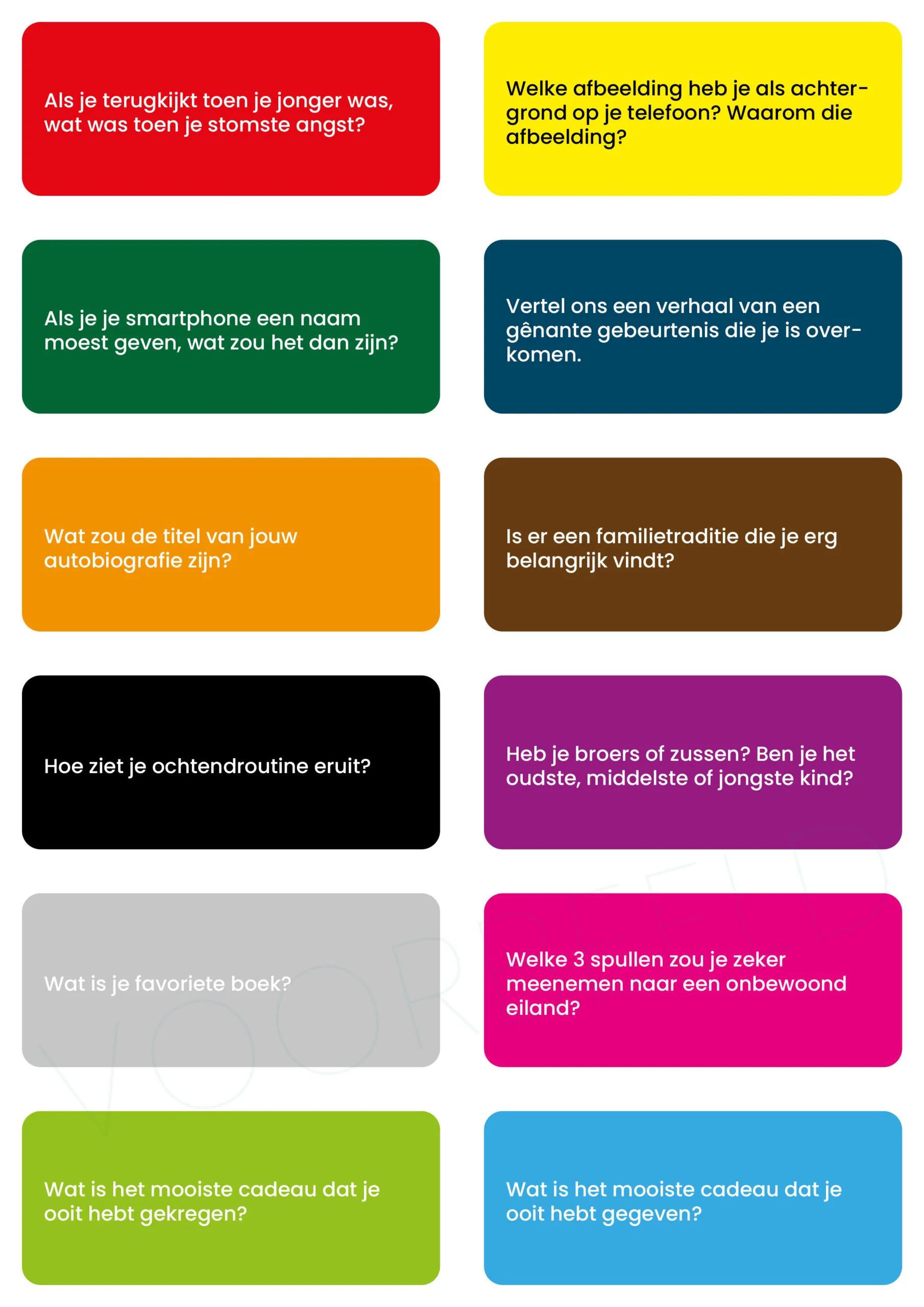 De bedoeling van de ijsbrekervragen is dat leerlingen/ studenten aan de hand van de ijsbrekervragen hun eigen verhaal vertellen aan de groep, zodat iedereen meer over elkaar te weten komt. Zo heb je een goede basis voor positieve groepsvorming. Tijd: 30 – 45 minuten. Aantal spelers: 2 – 4. Totaal 60 ijsbrekervragen per groep.