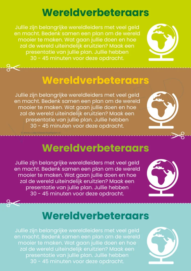Leerlingen/ studenten gaan in viertallen een plan bedenken om de wereld mooier te maken. Een leuke creatieve activiteit waarbij ze goed naar elkaar moeten luisteren, rekening met elkaar moeten houden, creatief moeten zijn en keuzes moeten maken. De plannen worden in een volgende les gepresenteerd aan de klas. Tijd: 30 – 45 minuten